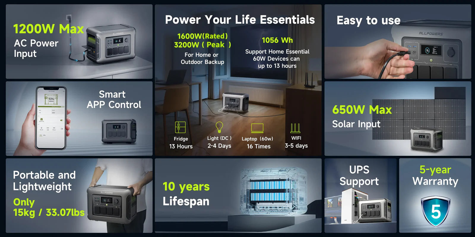 Akumulator R1500 LITE wyposażony jest w doskonały akumulator litowo-żelazowo-fosforanowy. Ze względu na niską gęstość energii jest on cięższy od potrójnych akumulatorów litowo-jonowych, ale charakteryzuje się doskonałym czasem cyklu. Dzięki naszej unikalnej technologii cykl życia akumulatora ALLPOWERS R1500 przekracza 3500. Nawet przy codziennym użytkowaniu będzie on działał około 10 lat lub dłużej.