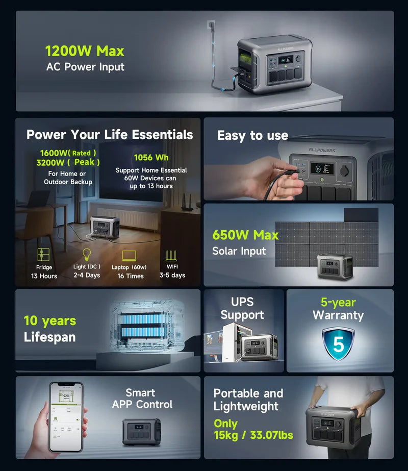 ALLPOWERS R1500 LITE Stacja Zasilania 1600W 1056Wh Akumulator LiFePO4