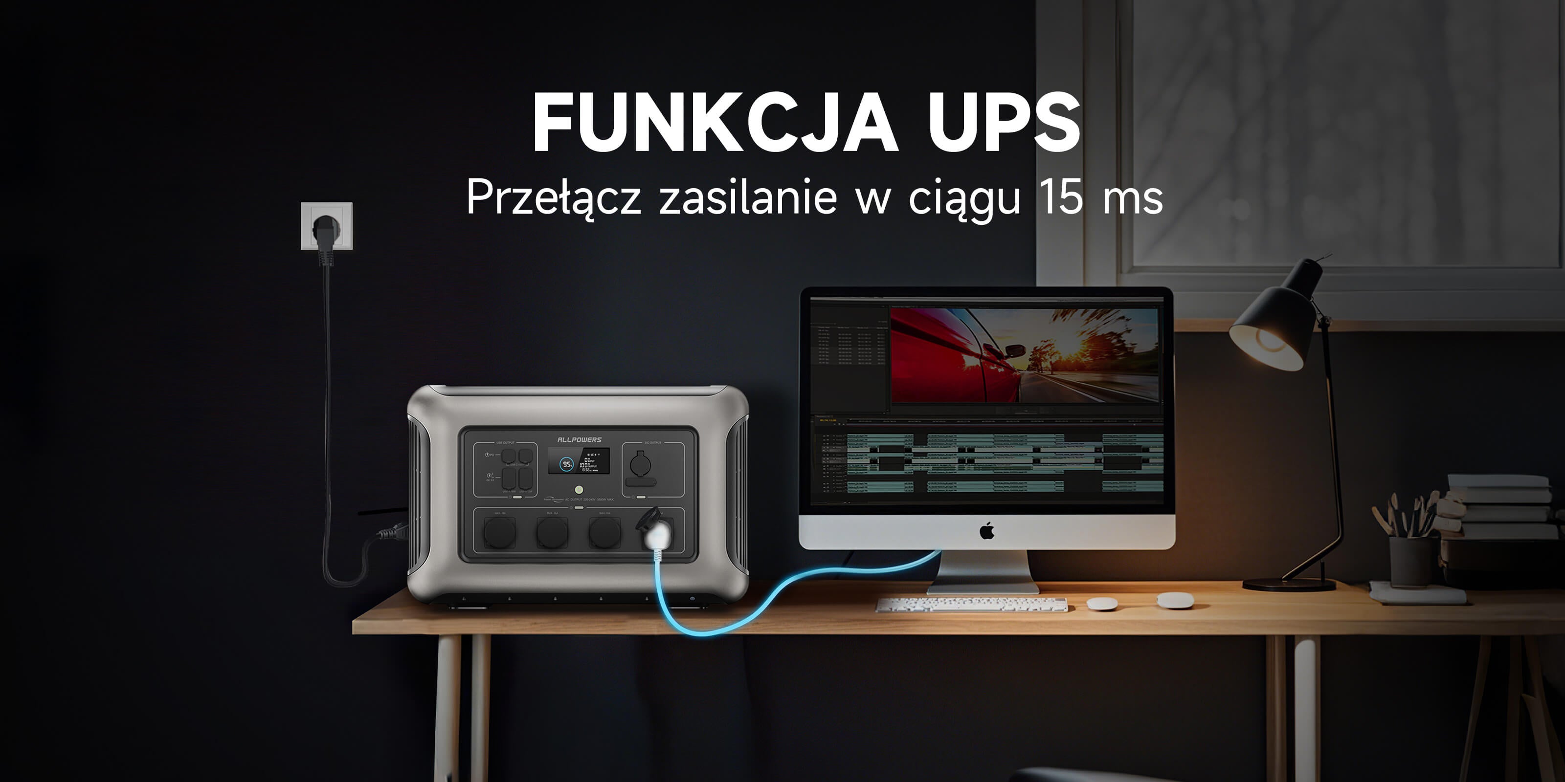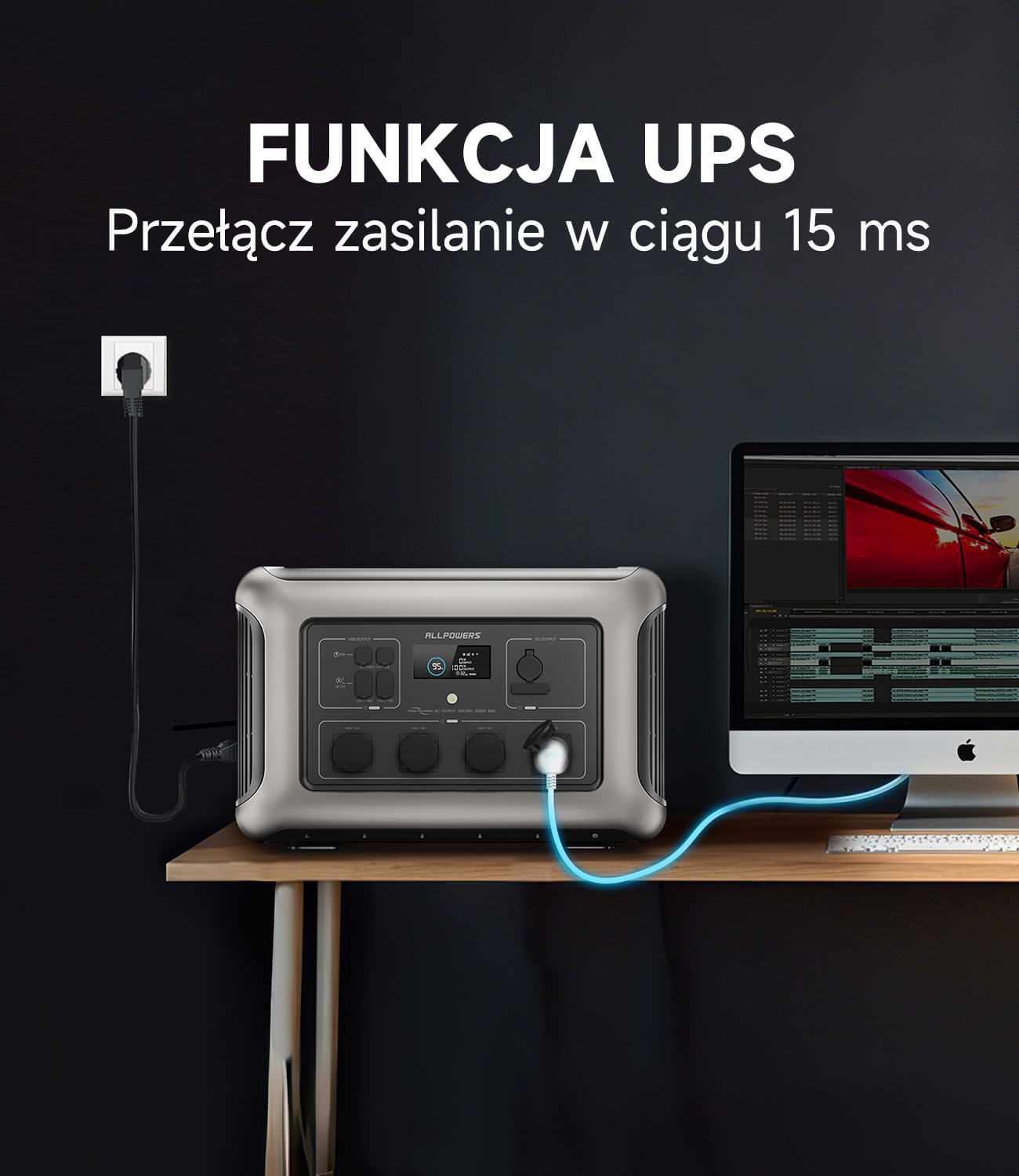 Przenośny zasilacz ALLPOWERS R3500 jest wyposażony w UPS (zasilanie awaryjne). Po włączeniu funkcji UPS, nawet jeśli nastąpi nagła awaria zasilania, podłączone produkty elektryczne nie zatrzymają się i mogą być używane tak, jak są. Podczas przełączania występuje chwilowa przerwa, ale tylko 15 ms, jeśli przełączanie trwa dłużej. Ponieważ prąd zwykłego domowego gniazdka prądu przemiennego wynosi 15 A, maksymalna moc wyjściowa wynosi 1500 W w trybie UPS.