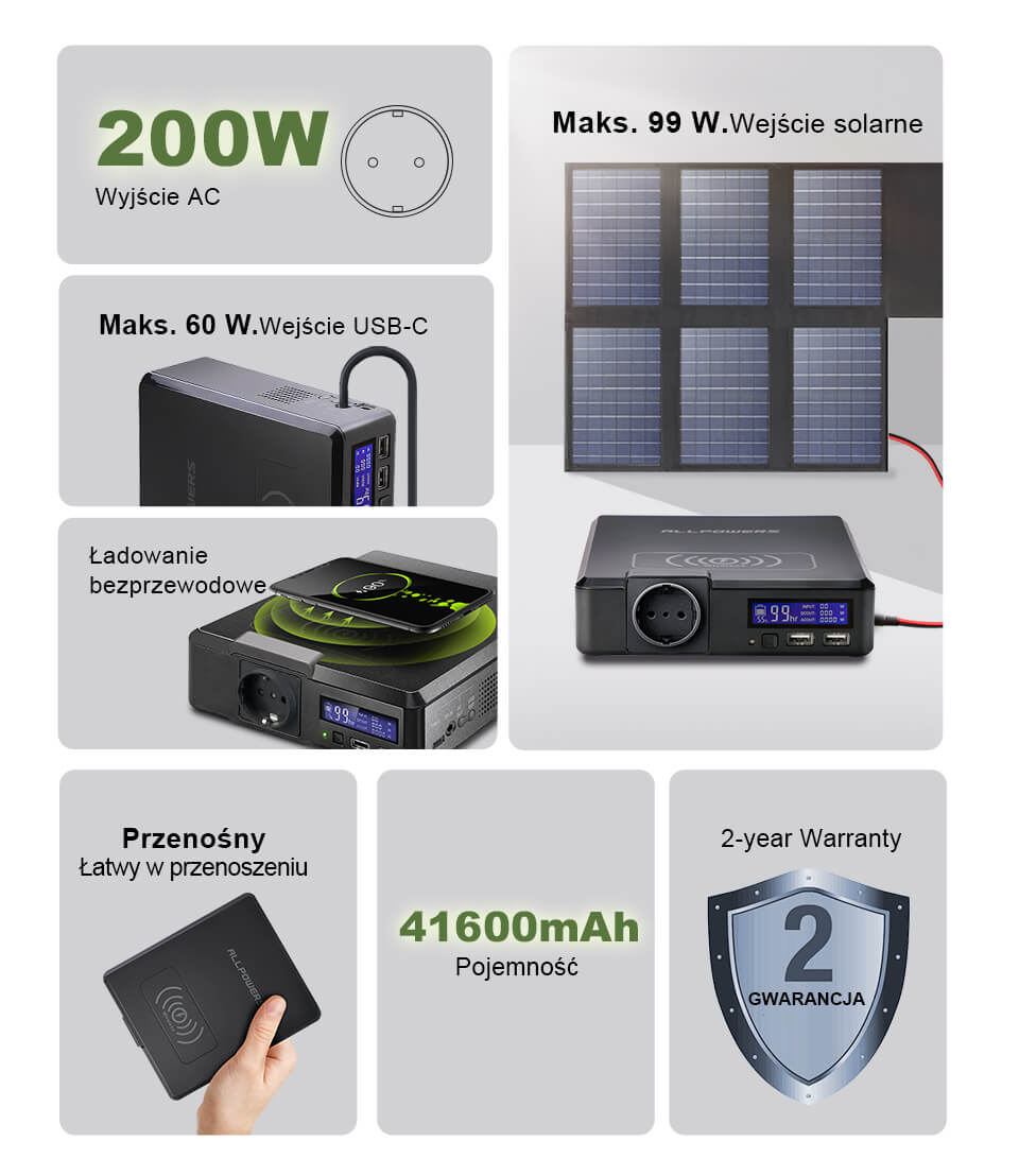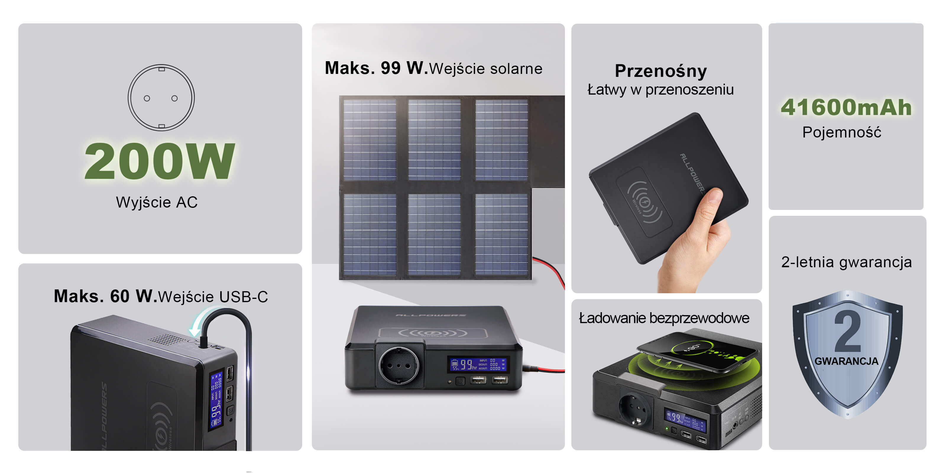 Należy pamiętać, że porty wyjściowe AC mogą ładować tylko urządzenia, które działają z mocą mniejszą niż 200 W, poza tym całkowita moc powinna być również mniejsza niż 200 watów. Po przekroczeniu tej wartości ALLPOWERS S200 wyłączy się automatycznie. Przed zakupem należy zapoznać się ze specyfikacją urządzenia.
