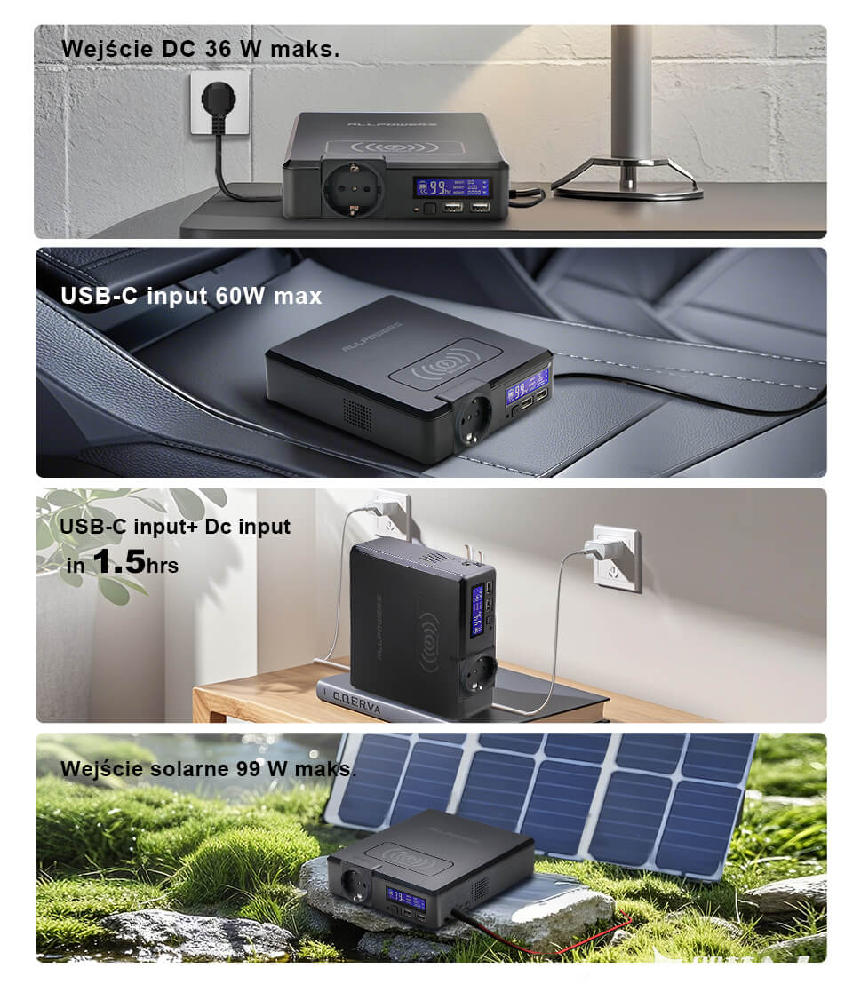 - 3 sposoby ładowania (USB-C+AC+ładowarka słoneczna)