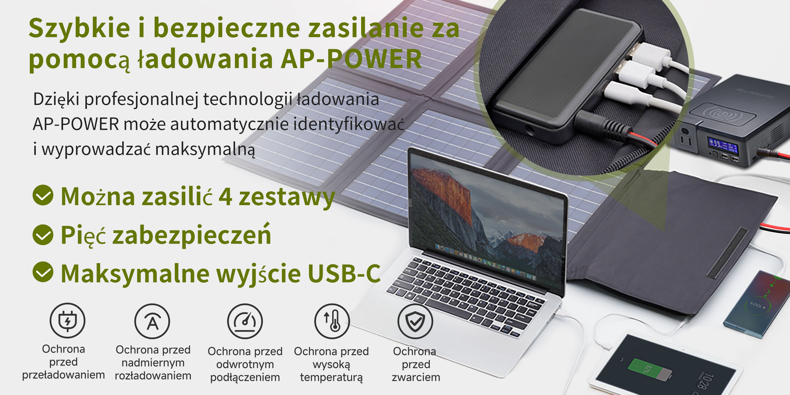 Ogniwo słoneczne o mocy 60 W wykonane jest z solidniejszego materiału dobrej jakości, ma wydajność do 22% i zapewnia nieograniczoną moc dla laptopa i innych baterii zasilanych słońcem.