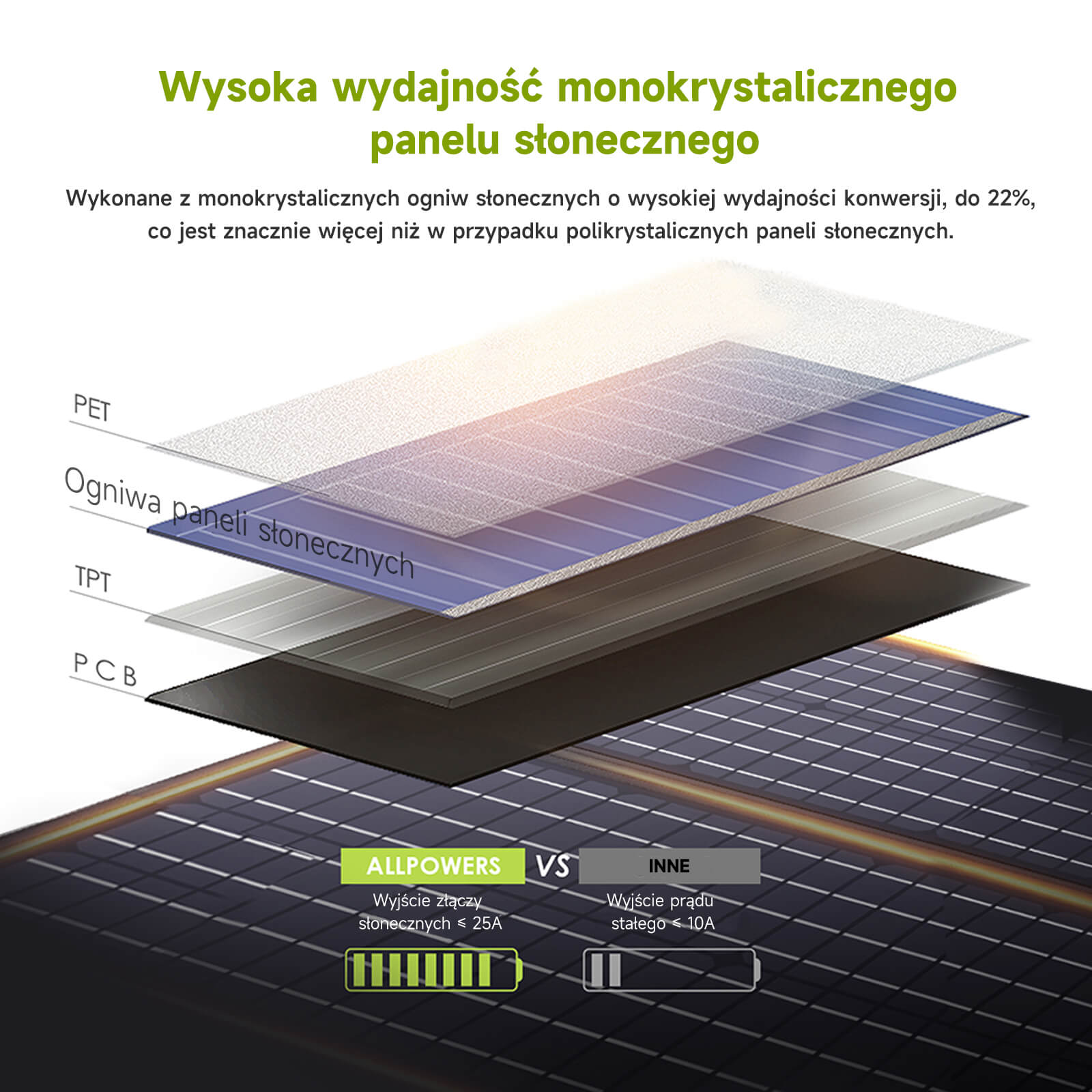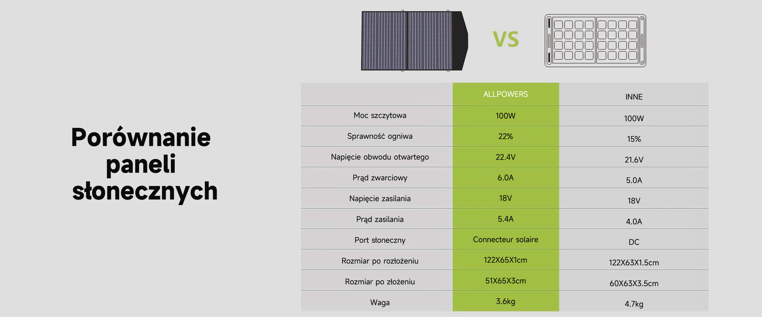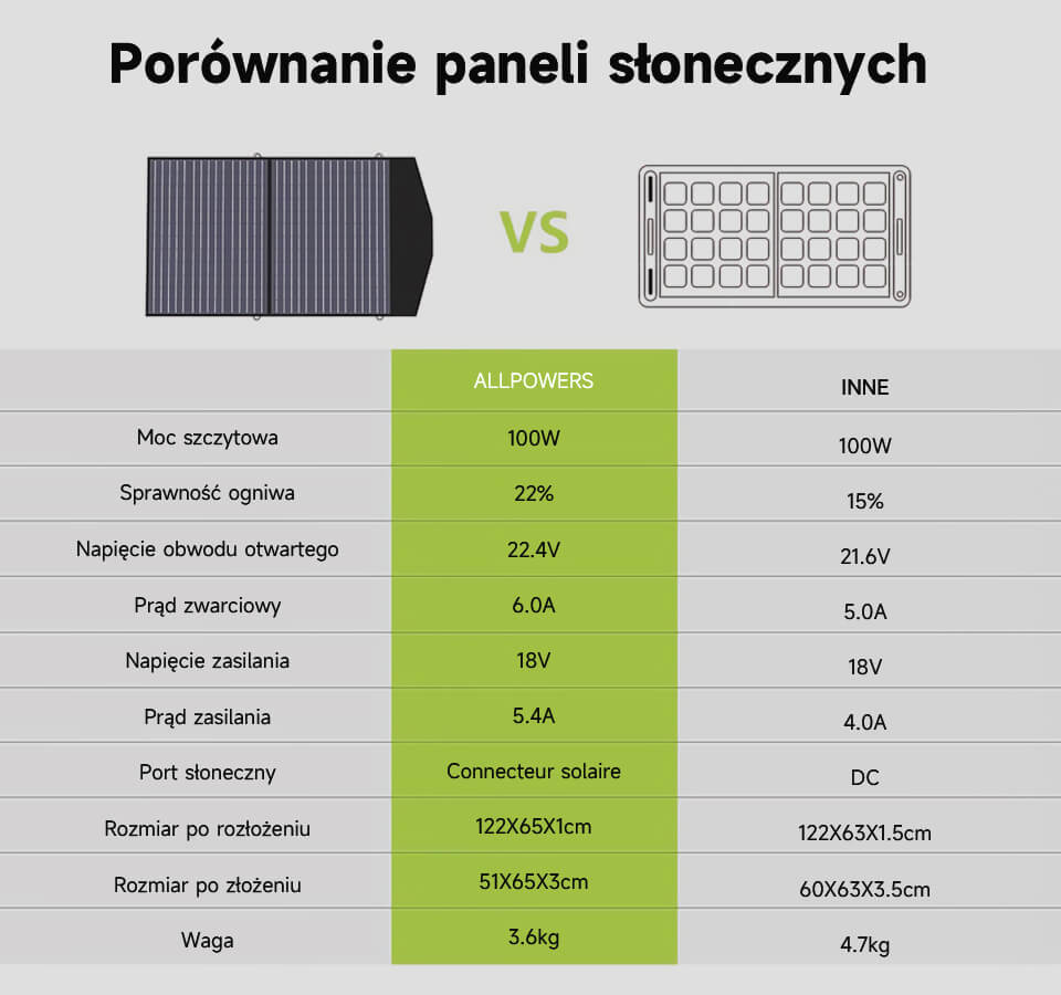 Zestaw przenośnych paneli słonecznych ALLPOWERS 100 W jest produkowany w USA, do 22% wydajności, o 1/3 lżejszy od tej samej mocy krzemu słonecznego. Całkowita moc wzrosła o 1/3 w porównaniu z tym samym rozmiarem zestawu przenośnych paneli słonecznych.