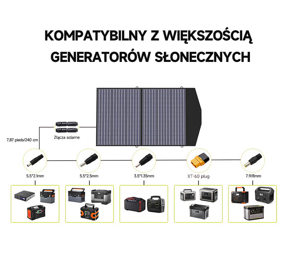 Składany panel słoneczny ALLPOWERS 100W jest kompatybilny z większością generatorów słonecznych/przenośnych elektrowni dostępnych na rynku. Zestaw przenośnych paneli słonecznych zawiera złącza o różnych rozmiarach do generatorów przenośnych (złącze słoneczne do Andersona / złącze słoneczne do DC)