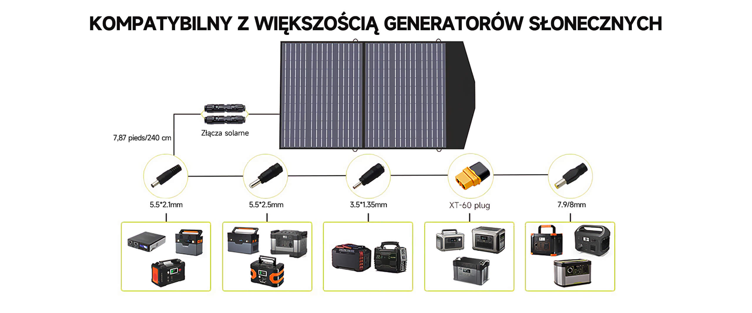 - Kompatybilny z większością generatorów słonecznych ze złączami słonecznymi;