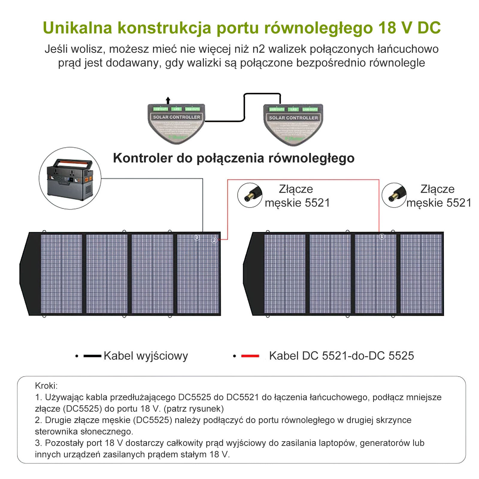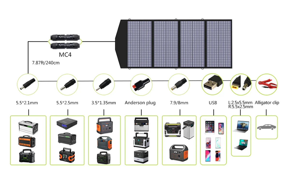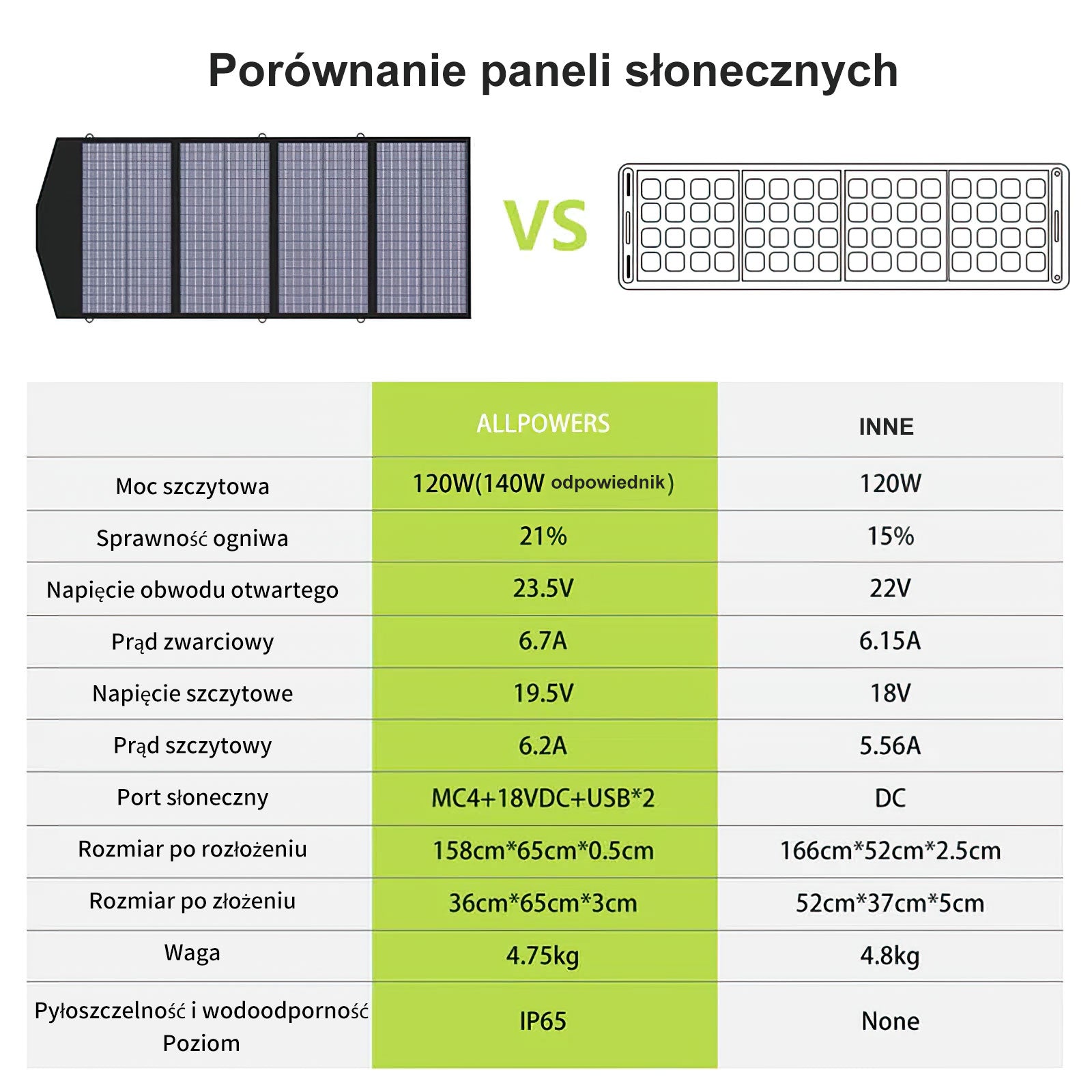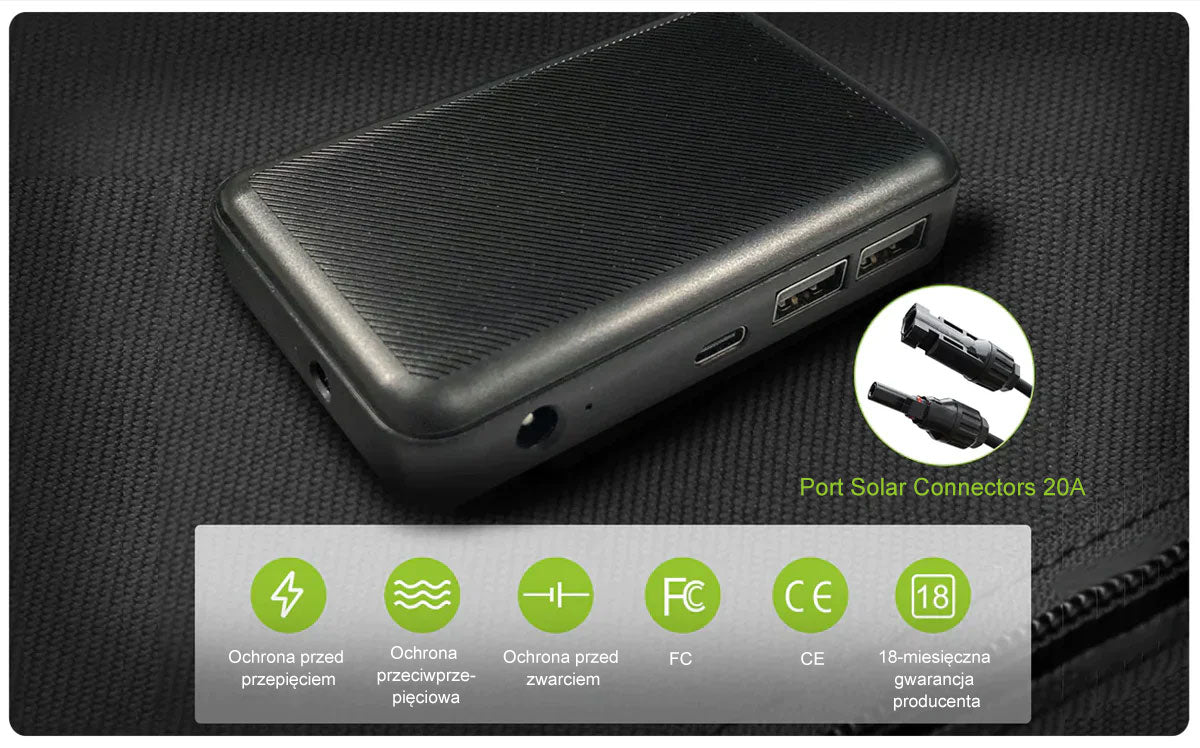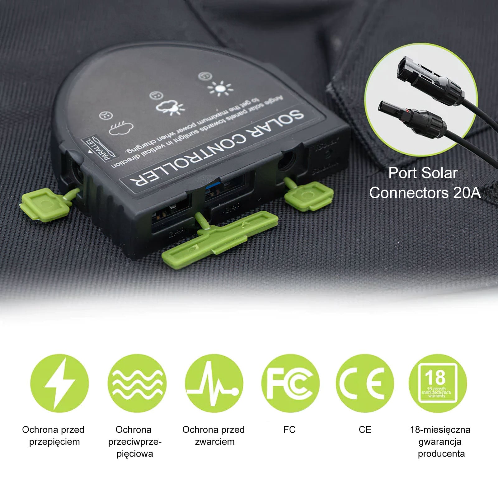 Wyposażony w złącze Solar i regulator DC, panel słoneczny ALLPOWERS 140W jest w pełni kompatybilny z większością generatorów słonecznych dostępnych na rynku.