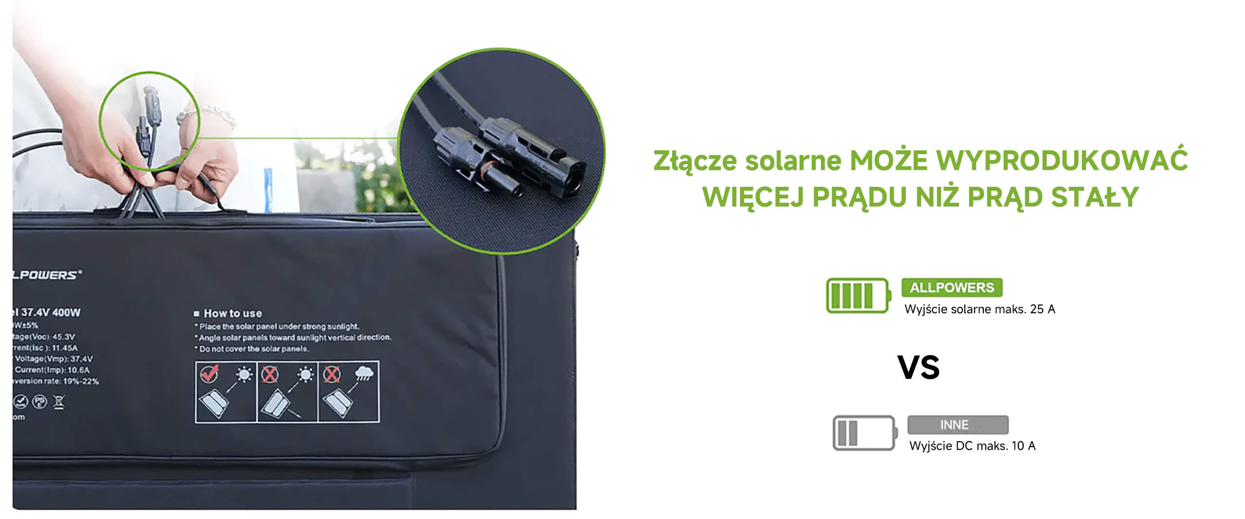 Panel słoneczny ALLPOWERS SP037 400 W zapewnia ogromną moc 37,4 V dla Twoich generatorów słonecznych, takich jak ALLPOWRS S2000/S2000 Pro /R4000/R3500/R2500/R1500 i innych dużych generatorów na rynku. Z portami wyjściowymi złącza słonecznego. Efektywnie skraca czas ładowania, dzięki czemu możesz cieszyć się energią słoneczną tak szybko, jak to możliwe.