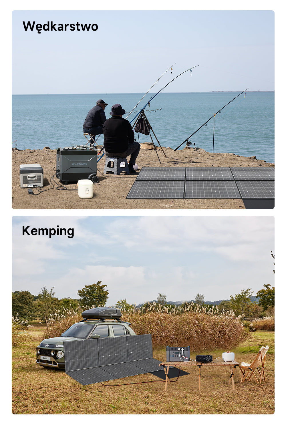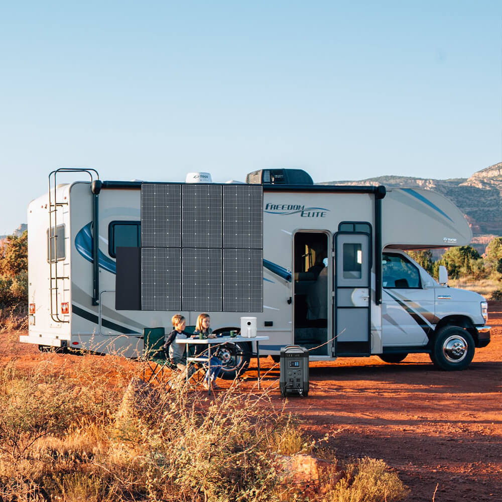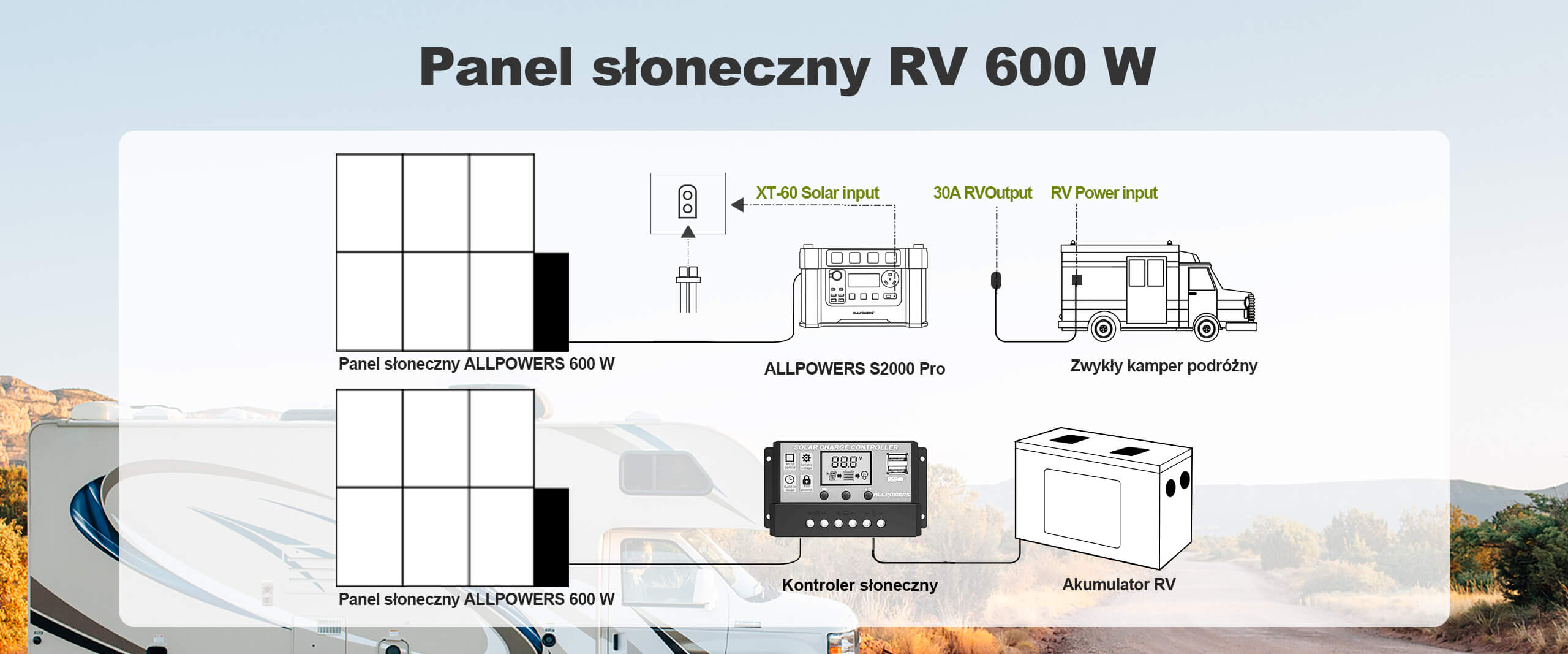 Dzięki portom wyjściowym Solar Connector, panel słoneczny ALLPOWERS 600W zapewnia ogromną moc 44 V dla Twoich generatorów słonecznych, takich jak ALLPOWRS S2000 Pro/R4000/R3500/R2500/R1500 i innych dużych generatorów dostępnych na rynku. Doskonały do podróży kamperem, ponieważ łatwo go zamocować na górze kampera.