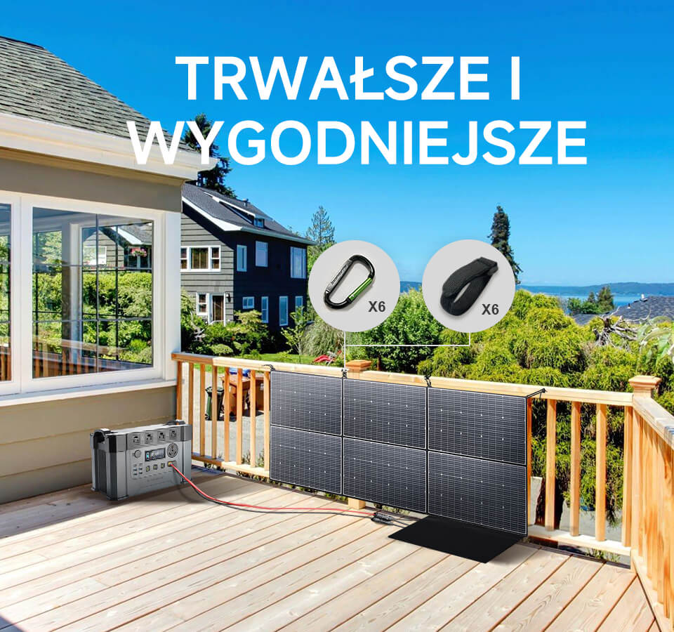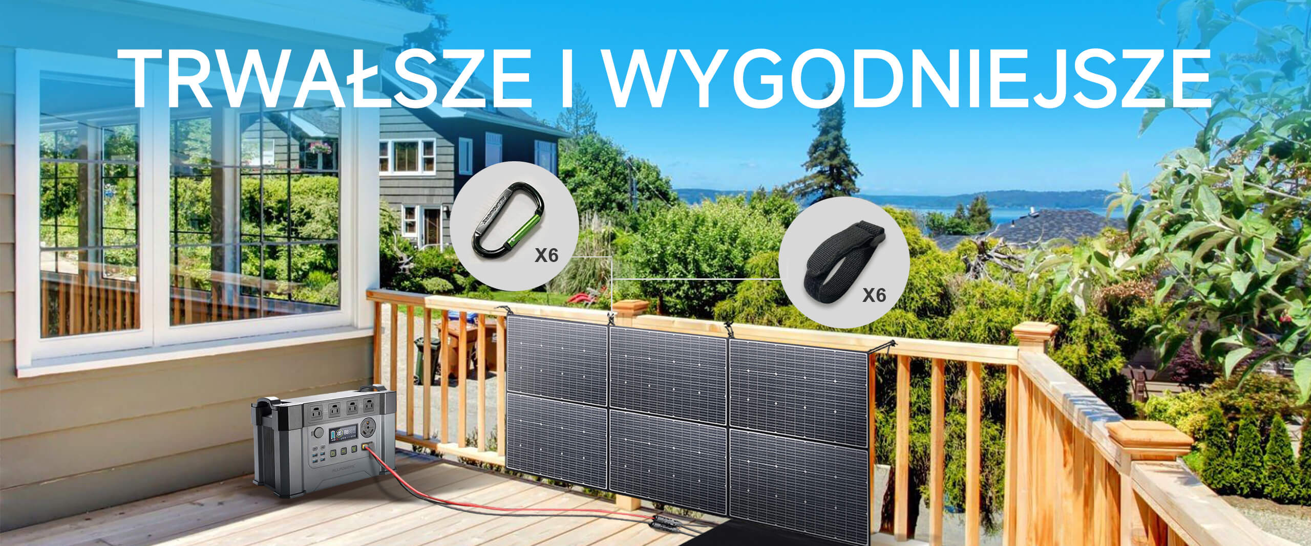 Panel słoneczny SP039 o mocy 600 W wyposażono w 6 czarnych lin z klamrami i 6 karabińczyków, które można przymocować lub zapiąć w miejscu, w którym ma zostać zamontowany panel słoneczny, aby zapobiec jego niestabilnemu ustawieniu, uzyskać więcej światła słonecznego i zwiększyć wydajność konwersji energii słonecznej.