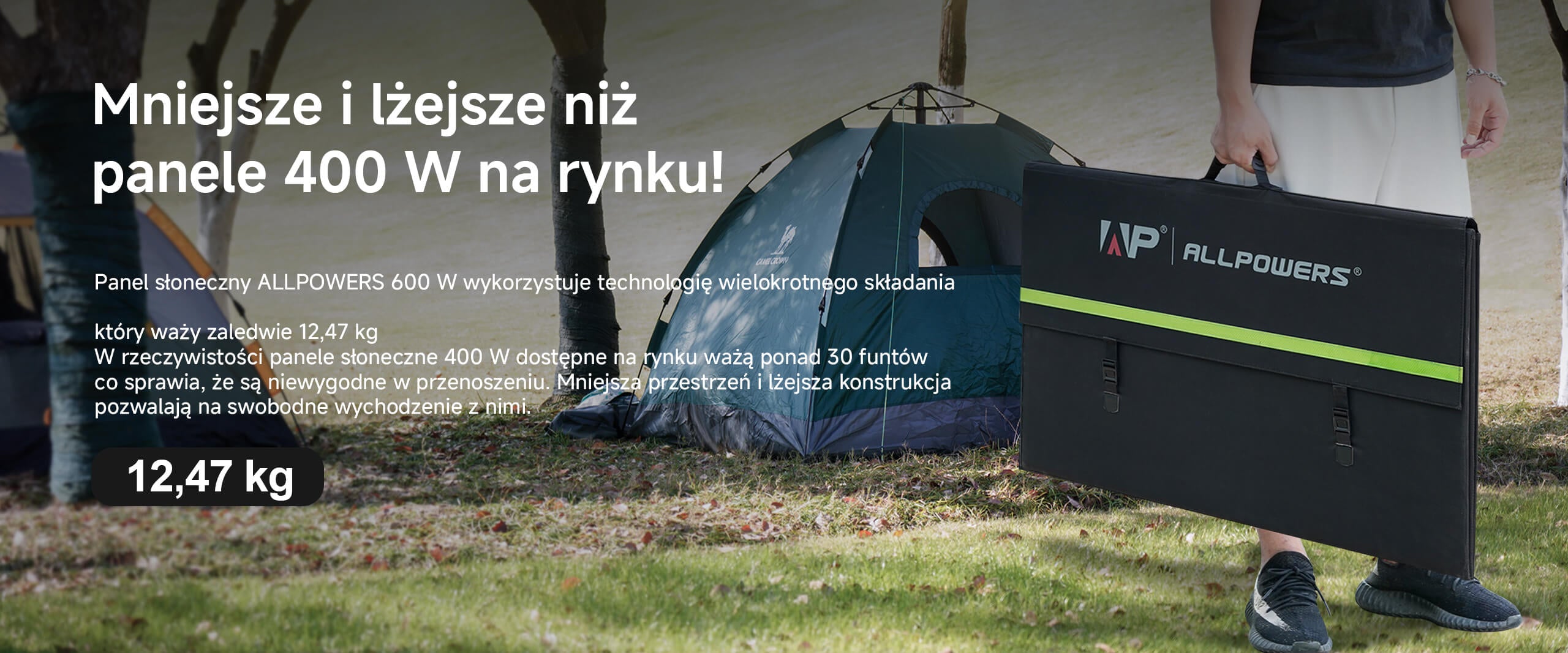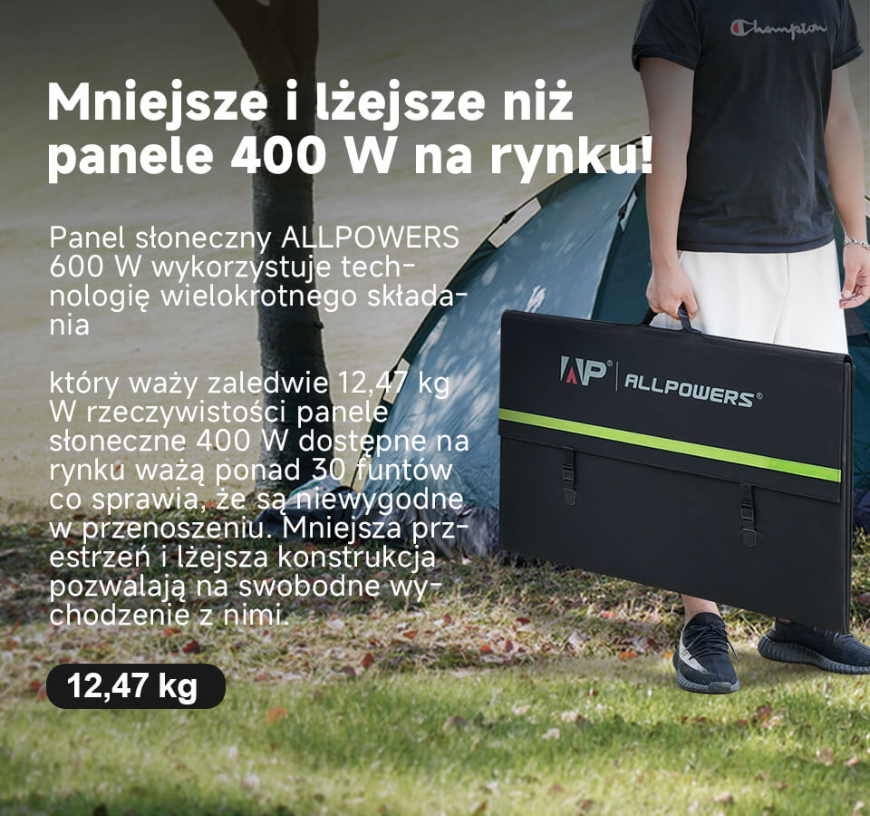 Panel słoneczny ALLPOWERS 600W wykorzystuje technologię muli fold portable, która waży zaledwie 27,5 funta! W rzeczywistości panele słoneczne 400W dostępne na rynku ważą ponad 30 funtów, co sprawia, że są niewygodne w przenoszeniu. Mniejsza przestrzeń i lżejsza konstrukcja pozwalają na swobodne wychodzenie z nimi.